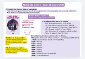 Le jeudi 22 janvier, le collĂšge a accueilli pour la troisiĂšme annĂ©e consĂ©cutive sa Nuit de la Lecture, organisĂ©e par lâĂ©quipe de Lettres et la professeure documentaliste. De 17h00 Ă 19h45, les Ă©lĂšves volontaires ont vĂ©cu une soirĂ©e placĂ©e sous le signe du partage, de la crĂ©ativitĂ© et du plaisir de lire.