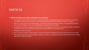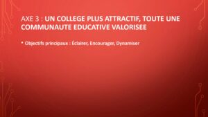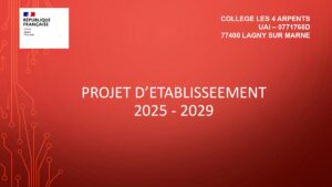 Le projet d’établissement définit les objectifs éducatifs, pédagogiques et citoyens du collège. Construit en concertation avec l’ensemble de la communauté éducative, il fixe les priorités pour améliorer la réussite scolaire, accompagner chaque élève dans son parcours et renforcer le partenariat avec les familles et les acteurs locaux. Ce document de référence guide les actions quotidiennes de l’établissement et traduit les valeurs de l’École de la République.